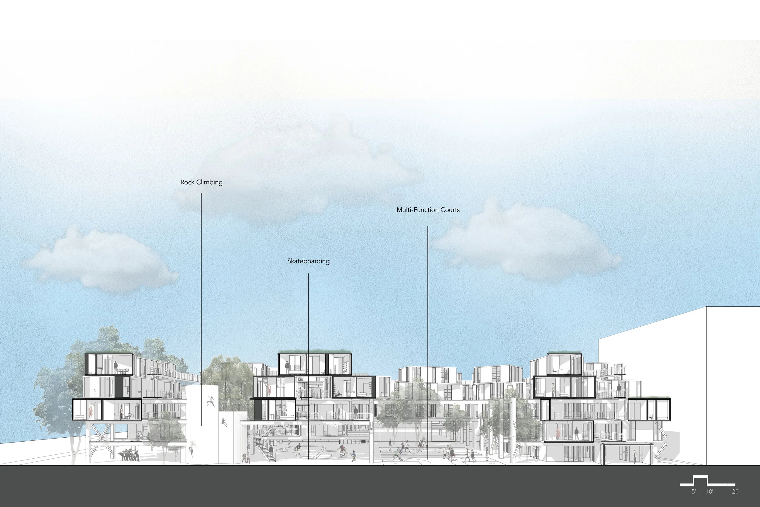 recreational programs. Keeping in place as much of the existing parking garage as possible, the new addition embraces the original concrete nature and