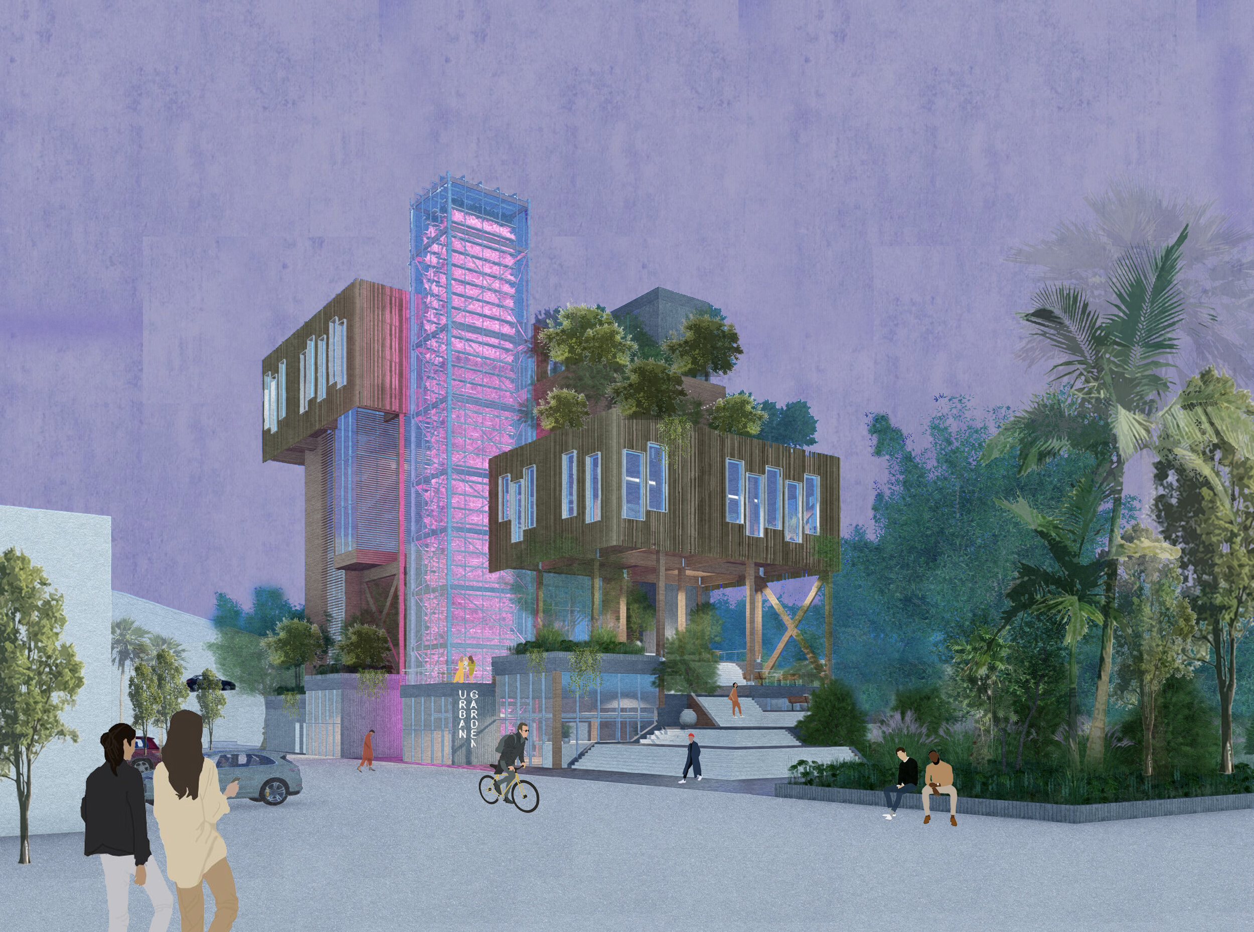 Starting with an initial site massing, the private and public are separated vertically. Next, the masses are broken down for an approachable scale. Finally, the private and public are connected to a vertical farm to provide vegetation for local restaurants and markets.